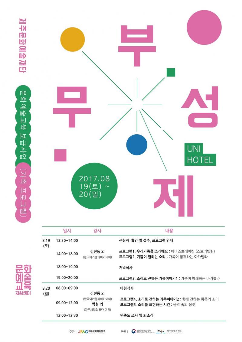 - 진행일시:2017년 8월19일(토)~20일(일) 1박 2일 - 장소:유니호텔 (제주시 애월읍) - 대상:제주도내 거주 2~3세대 3인 이상의 가족 구성원 - 이메일접수:cera724@jfac.kr ※ 프로그램 특성상 초등학생 이상 자녀를 둔 가족에 한하여 참여 신청 가능