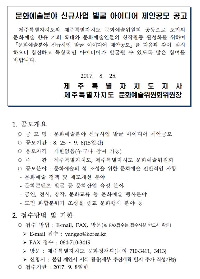 1. 문화예술분야 신규사업 발굴 아이디어 제안공모 공고.hwp (23 KBytes)