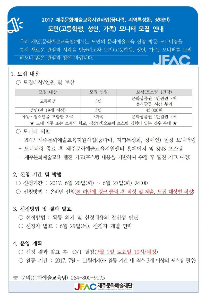 2017 제주문화예술교육지원사업(꿈다락, 지역특성화, 장애인) 도민(고등학생, 성인, 가족) 모니터 모집