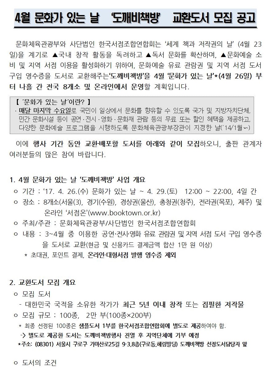 4월 도깨비책방 교환도서 모집 공고(문체부/한국서점조합연합회)